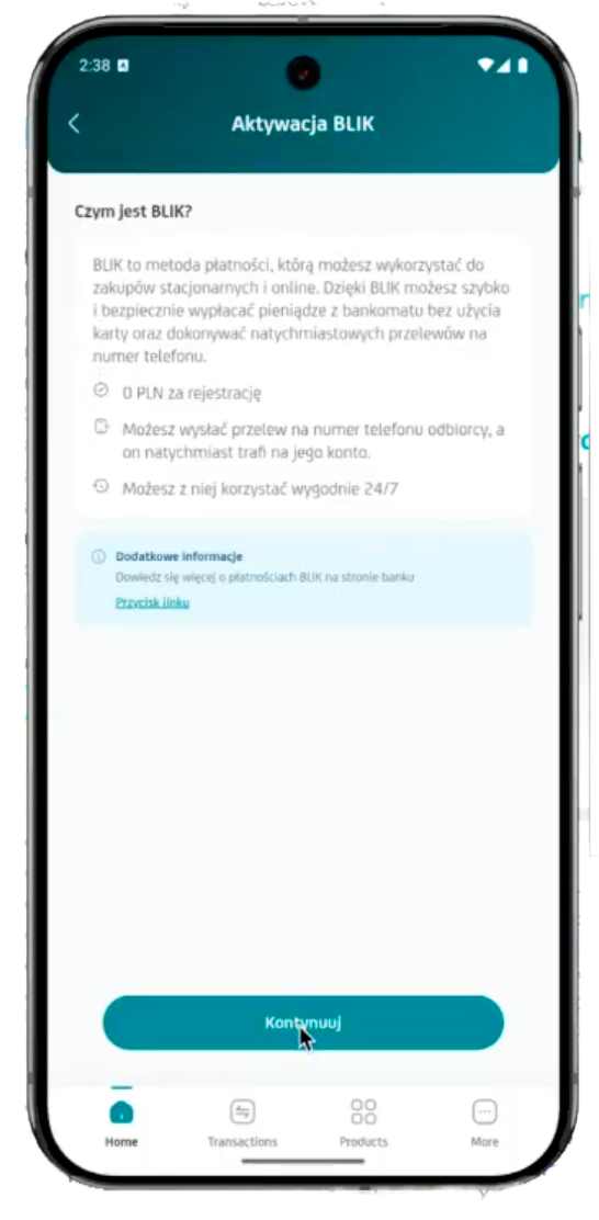 4. Następnie na ekranie wyświetlamy konto, które będzie używane do transakcji BLIK - zawsze jest to Twoje konto główne. Następnie wybierz 'Aktywuj BLIK'.